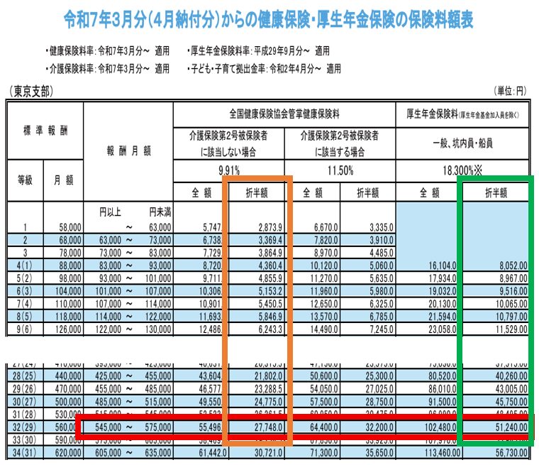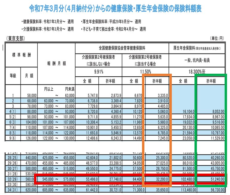 『厚生年金保険料』軸の”折半額”列(みどり枠の部分)を見ます。