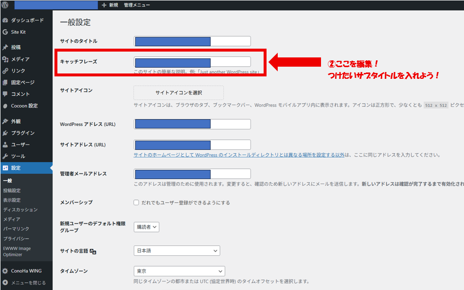 【タイトル設定手順①】と同じ手順で”一般設定ページ”に進もう!